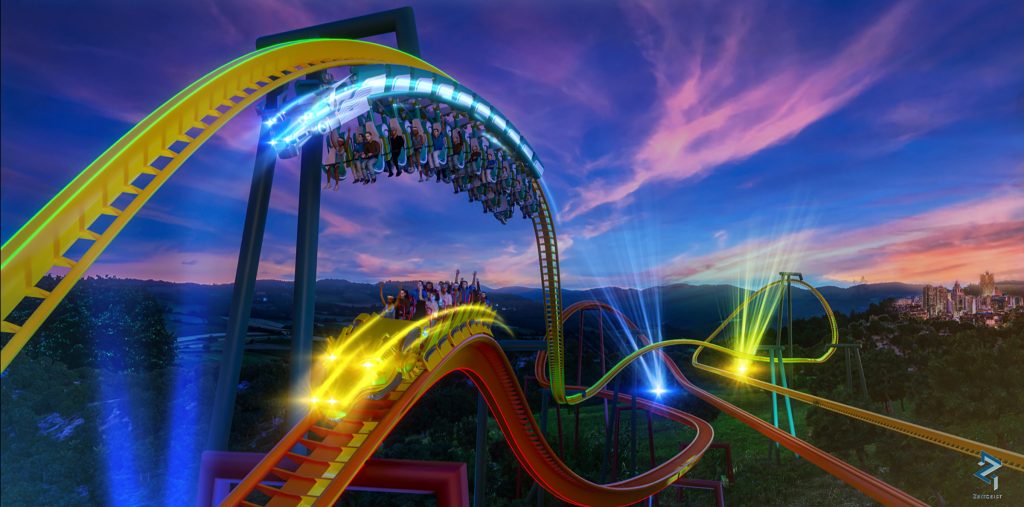 In 2020, Chimelong Group began developing a new area of their Zhuhai, China resort – home to its successful Ocean Kingdom theme park. Zeitgeist designed Space Race, a space-themed looping roller coaster which loads inside an interplanetary mothership, launches through a media tunnel and sends the space pod-themed trains racing through an intergalactic landscape illuminated with millions of LED stars.