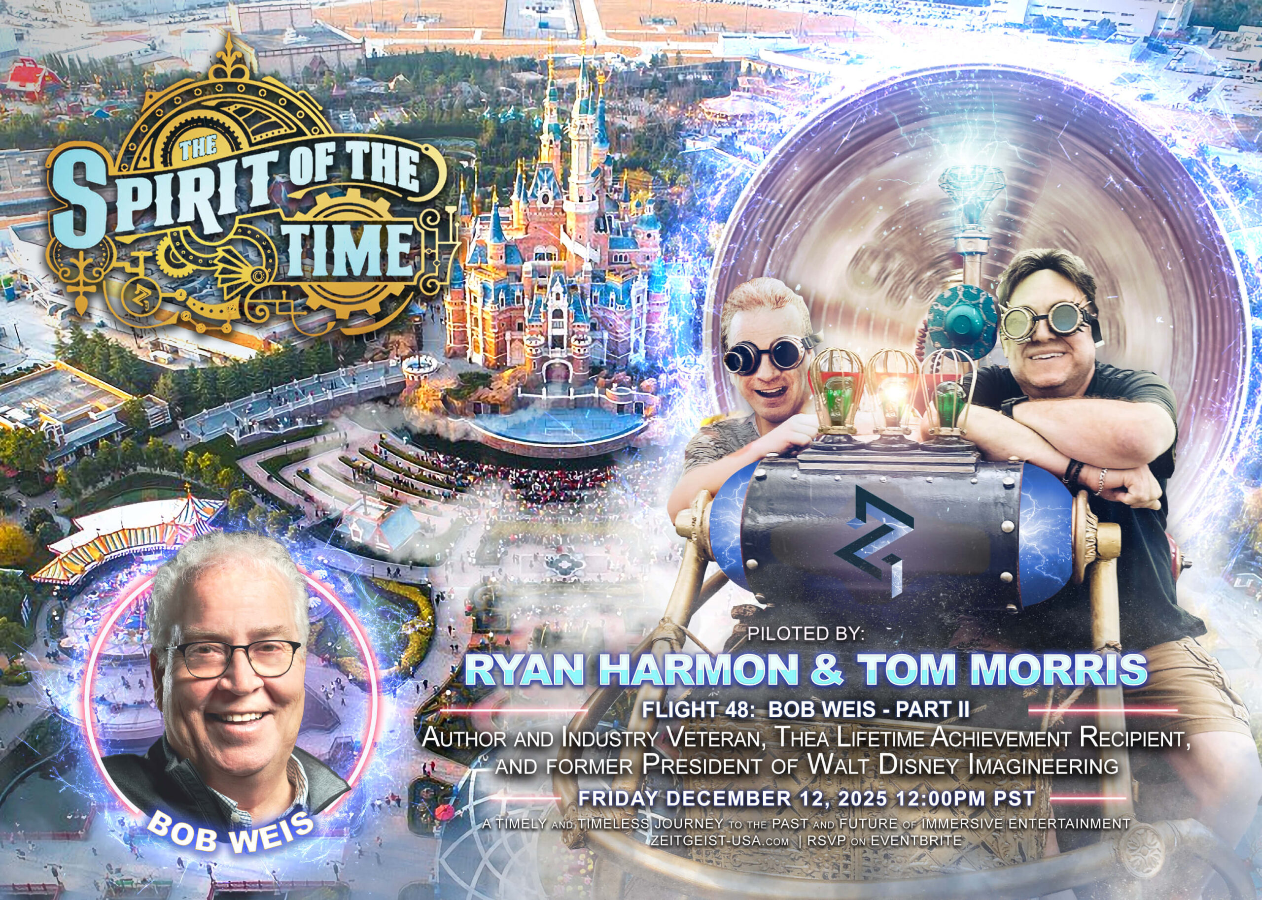 Piloting the monthly time machine trip are Ryan Harmon, President, and Joe Lanzisero, Executive Creative Director, Zeitgeist Design & Production, veterans of Walt Disney Imagineering, Universal Creative, Warner Bros. Recreation, Caruso Affiliated, The Hettema Group, and BRC Imagination Arts, among others. The two time travelers host the live series, which debuted on April 30, 2021 and continues monthly. Access to the hour-long episode is through Eventbrite at www.eventbrite.com; an RSVP is required to view. Join our mailing list to receive invitations!